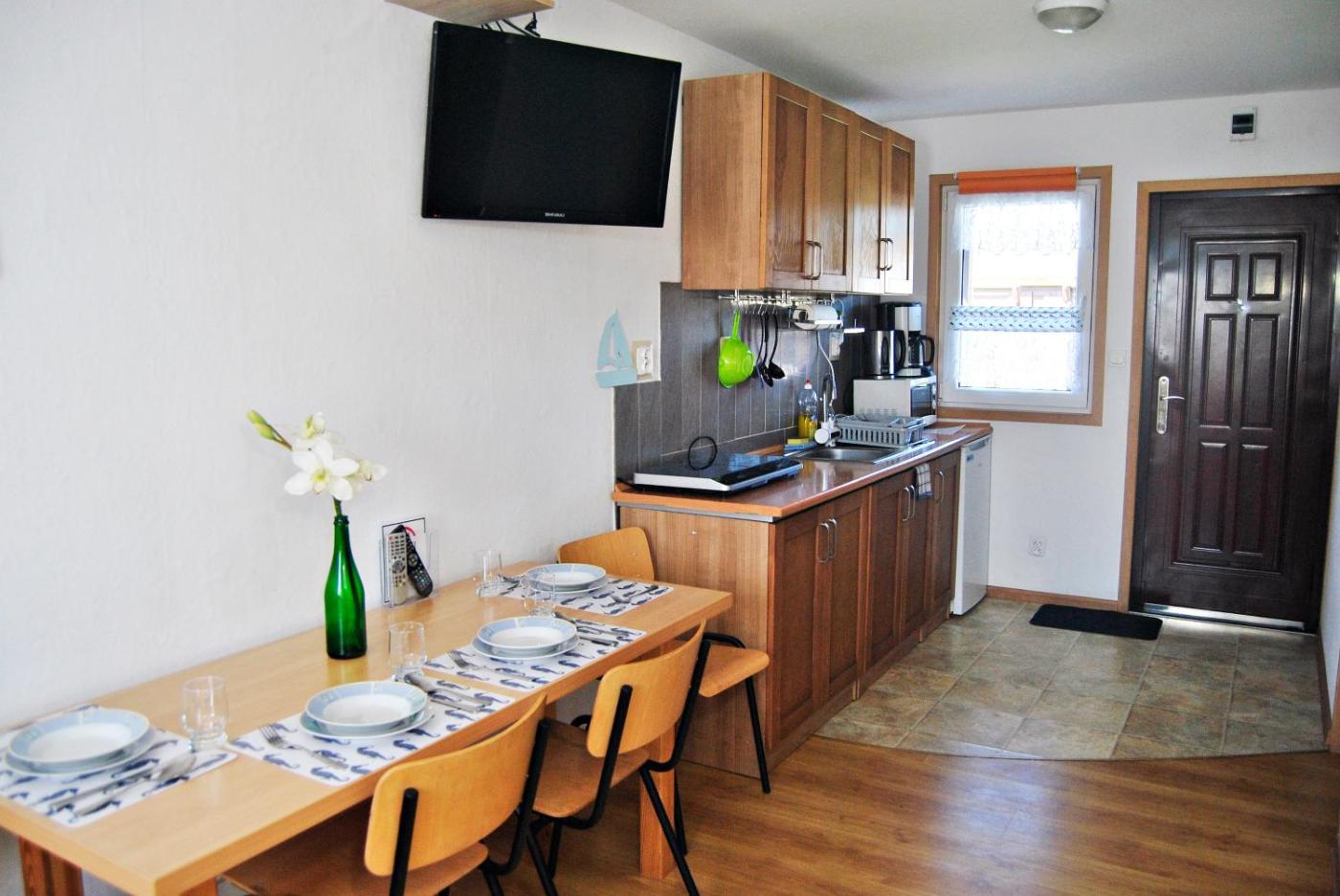 Domek z 2 sypialniami. Boasting a private entrance, this air-conditioned chalet comes with 1 living room, 2 separate bedrooms and 1 bathroom with a shower. Guests will find a stovetop, a refrigerator, kitchenware and a microwave in the fully equipped kitchenette. The chalet also includes a barbecue. Featuring a terrace with garden views, this chalet also features soundproof walls and a flat-screen TV. The unit has 4 beds. Domek - 5 osobowy. Powierzchnia pokoju ok.: 30 mkw.