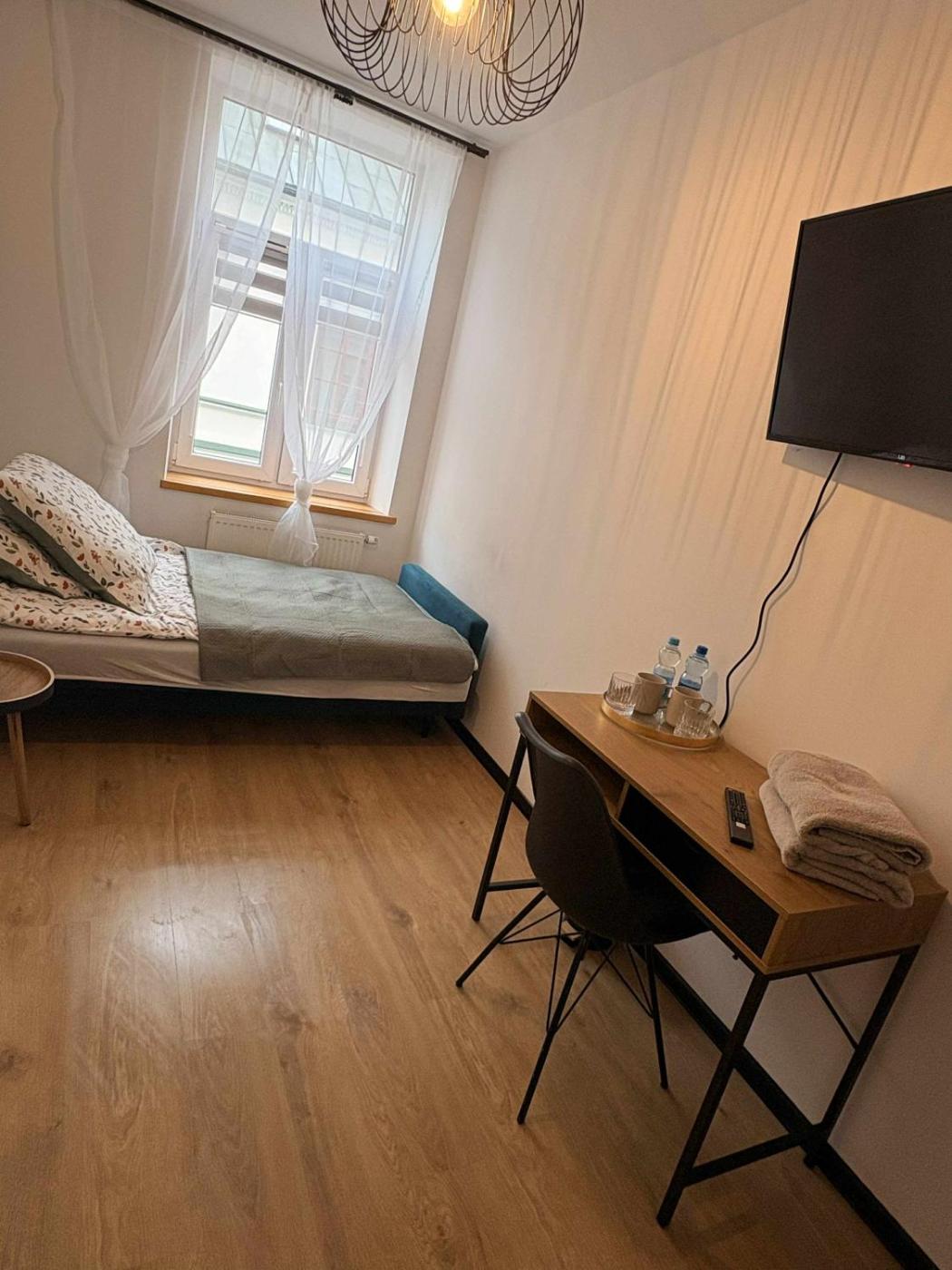 Mały pokój Dwuosobowy. Featuring free toiletries, this double room includes a shared bathroom with a shower and a hairdryer. Guests can make meals in the kitchen that features a stovetop, a refrigerator, kitchenware and an oven. The double room features a flat-screen TV with streaming services, a washing machine, a tea and coffee maker, a dining area as well as city views. The unit has 1 bed. Pokój Dwuosobowy - 2 osobowy. Powierzchnia pokoju ok.: 14 mkw. ;
